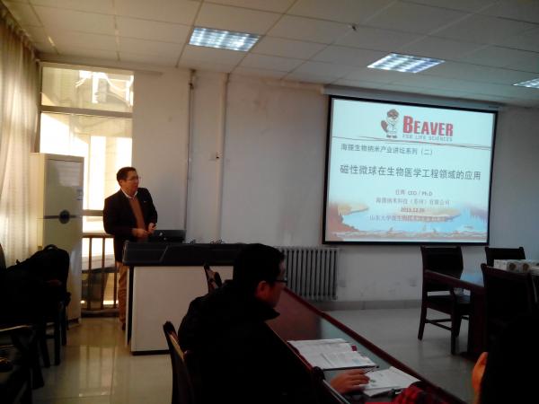 12月26日海貍納米走進(jìn)山東大學(xué)生命科學(xué)院,舉辦了“海貍生物納米產(chǎn)業(yè)”全國(guó)巡回首場(chǎng)講座。此次活動(dòng)由山東大學(xué)微生物技術(shù)國(guó)家重點(diǎn)實(shí)驗(yàn)室陳秀蘭教授主辦,海貍授權(quán)經(jīng)銷(xiāo)商濟(jì)南格非生物技術(shù)有限公司聯(lián)合承辦,任輝博士主講。