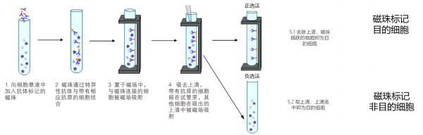 磁珠分選使用磁珠偶聯(lián)的抗體去標(biāo)記細(xì)胞,然后把標(biāo)記好的細(xì)胞懸液置于磁場中,帶磁珠的細(xì)胞就留在試管里,不帶磁珠的細(xì)胞在上清中,從而實現(xiàn)分選。